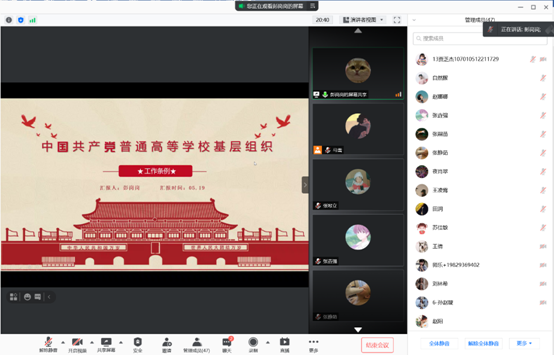 (通讯员 马雪)5月19日晚8点,2026年国际足联世界杯硕士党支部通过腾讯会议方式召开支部学习会议,集体学习《中国共产党普通高等公司基层组织工作条例》,会议有支部书记马雪主持,全体党员、预备党员参加。