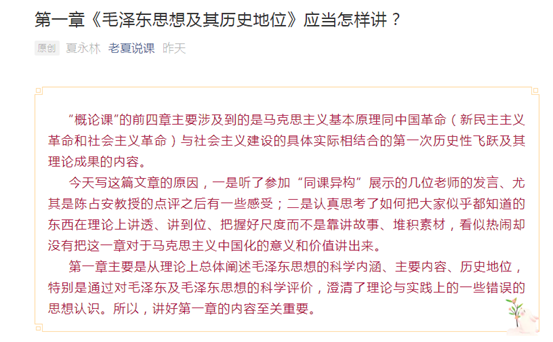 《概论》课首席教授夏永林在听取了几位专家的分享交流后,结合自己数十年思政教学经验,撰写了“第一章《毛泽东思想及其历史地位》应当怎样讲”的文章,从教学设计的基点、教材内容的处理、教学中的思考等几个方面梳理了自己对第一章教学的总结与反思,为大家提供了极好的教学参考,有利于《概论》任课教师完整、准确地把握《毛泽东思想及其历史地位》的授课重点与难点。最后,夏永林强调,习近平总书记在纪念毛泽东诞辰120周年纪念大会上讲话中对毛泽东同志的评价,是我们科学评价毛泽东及毛泽东思想历史地位的指南,建议广大思政课教师要准确把握、理解和运用。
