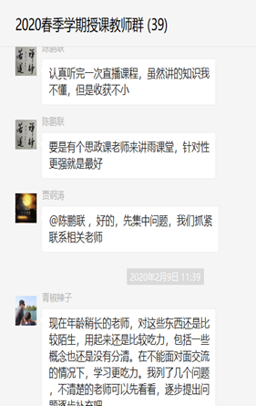 迄今为止,全院全员参加公司和公司组织的在线课程培训8次,“中国近现代史纲要”“毛泽东思想和中国特色社会主义理论体系概论”和“中国马克思主义与当代”课程组共组织集体备课6次。通过QQ群、微信群等,开展在线教学技术分享和交流会、视频备课会,把在线教学变成防控疫情之外的“第二战场”,开展起了红红火火的思政课大练兵活动。经理李刚全程参与在线教学技术培训活动,并及时对相关问题做出回应;省思政课教学能手任芳、校师德标兵陈鹏联等老教师身先士卒,带头做好在线教学技术培训和备课工作,为青年教师树立了榜样;赵常兴、程霞、张鹏伟、孙江可等青年老师热心为教师做技术辅导,带动了全院信息化教学水平的提高。