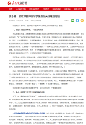 党委书记夏永林,利用微信公众号“老夏说课”,举起了思政战“疫”的旗帜。他在微信公众号上发表多篇原创文章,从学理和实践角度将疫情阻击战与思想政治教育紧密结合,唱响了“家国情怀”“使命担当”“服务人民”的时代主旋律。公众号文章《思政课教师面对员工应当关注这些问题》,入选人民网公开课,引起了普遍关注;原创文章启迪思想,引起了广大学子的强烈共鸣。