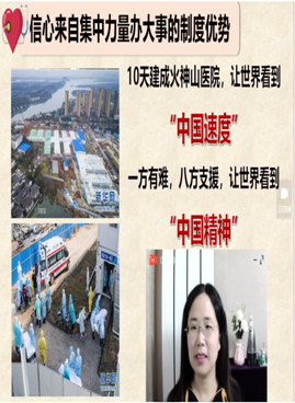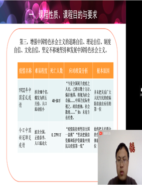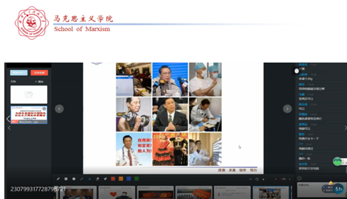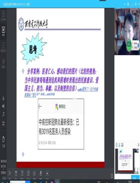 《概论》教研室支部书记程霞、青年教师孙金菊在开学第一课中,围绕教学目标和要求,将战“疫”故事有机嵌入教师主导讲授环节中,通过文章、图片、微视频等多种方式展示疫情防控中的中国精神和中国智慧,让员工在不断增强“四个自信”中激发爱国热情。青年教师徐雪强在“中国近现代史纲要”课程中,运用辩证唯物主义的原理分析了新中国成立之前国民党疫情防控的决策及后果和新时代在中国共产党领导下疫情防控的壮举及效果,让员工在今昔对比中感受社会主义制度优越性和中国力量。韦统义、赵武、孙江可等老师将抗“疫”诗词、名句引入教学,启迪员工思考。