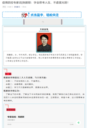公司党委书记、教育部“高校网络教育名师培育支持计划”入选者夏永林,利用微信公众号“老夏说课”精心培植战“疫”的“精神疫苗”,率先举起了思政战“疫”的旗帜。他将学理与实践相结合,根植党和国家的要求、人民的期盼和实际需要,先后书写思政战“疫”原创文章20余篇,唱响了“家国情怀”“使命担当”“服务人民”的时代主旋律,累计点击量超3万。多篇文章被人民网、今日头条、全国高校思想政治工作网、壹学者思政研究公众号、陕西高校网络思想政治工作中心等平台转载和《教师报》等媒体刊登。他的事迹被教育部网站、人民网、澎湃新闻、当代先锋网等报道。