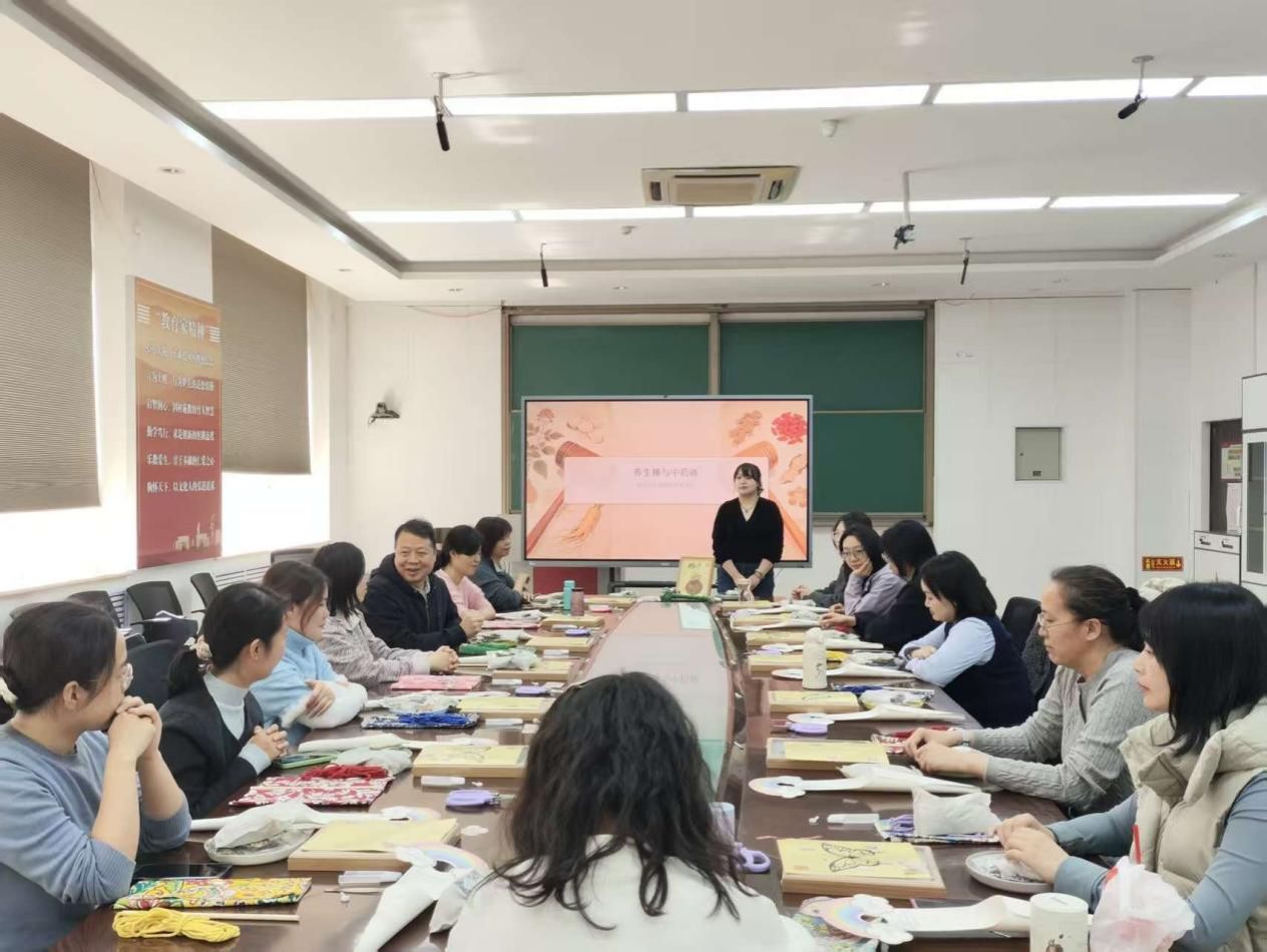 在艾草养生按摩锤制作环节,非遗老师结合教职工职业特点,详细介绍陈艾的功效,以及养生锤在缓解肩颈僵硬、改善肌肉疲劳等方面的积极作用。女教职工们认真倾听、专注动手实践,细致完成艾草填充、手柄缠绕等工序。作品完成后,大家共同学习体验养生操,在互动实践中舒缓身心、调养状态。在中草药香氛画创作环节,教职工们兴致盎然、创意迸发。大家根据自身香气偏好搭配草本原料,巧妙运用肌理层次营造艺术效果,精心制作出兼具观赏价值与香氛功能的非遗手作,在沉浸式体验中感受中华优秀传统文化的独特魅力。