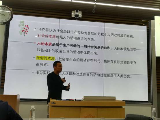 随后,四位青年教师随机抽取主题进行30分钟的公开课展示。首先由李瑾老师讲授“社会主义道德的核心与原则”,她从今年肆虐全球的新冠疫情引入,将中外抗“疫”的对比贯穿于教学展示中,来论证社会主义道德的核心是为人民服务,原则是集体主义。