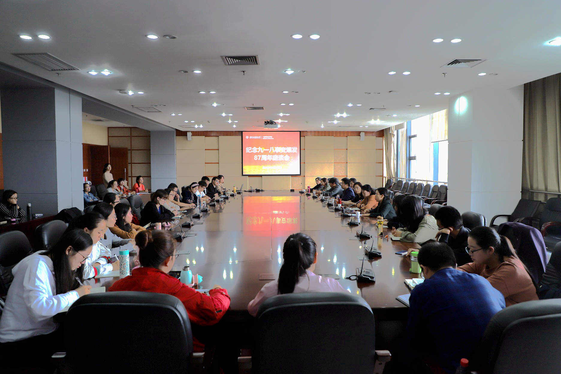 禹海霞老师为师生讲解了“九一八事变”的经过及全国纪念活动的开展情况,并强调“九一八事变”作为中国抗日战争的起点、世界反法西斯战争起点的重要意义。