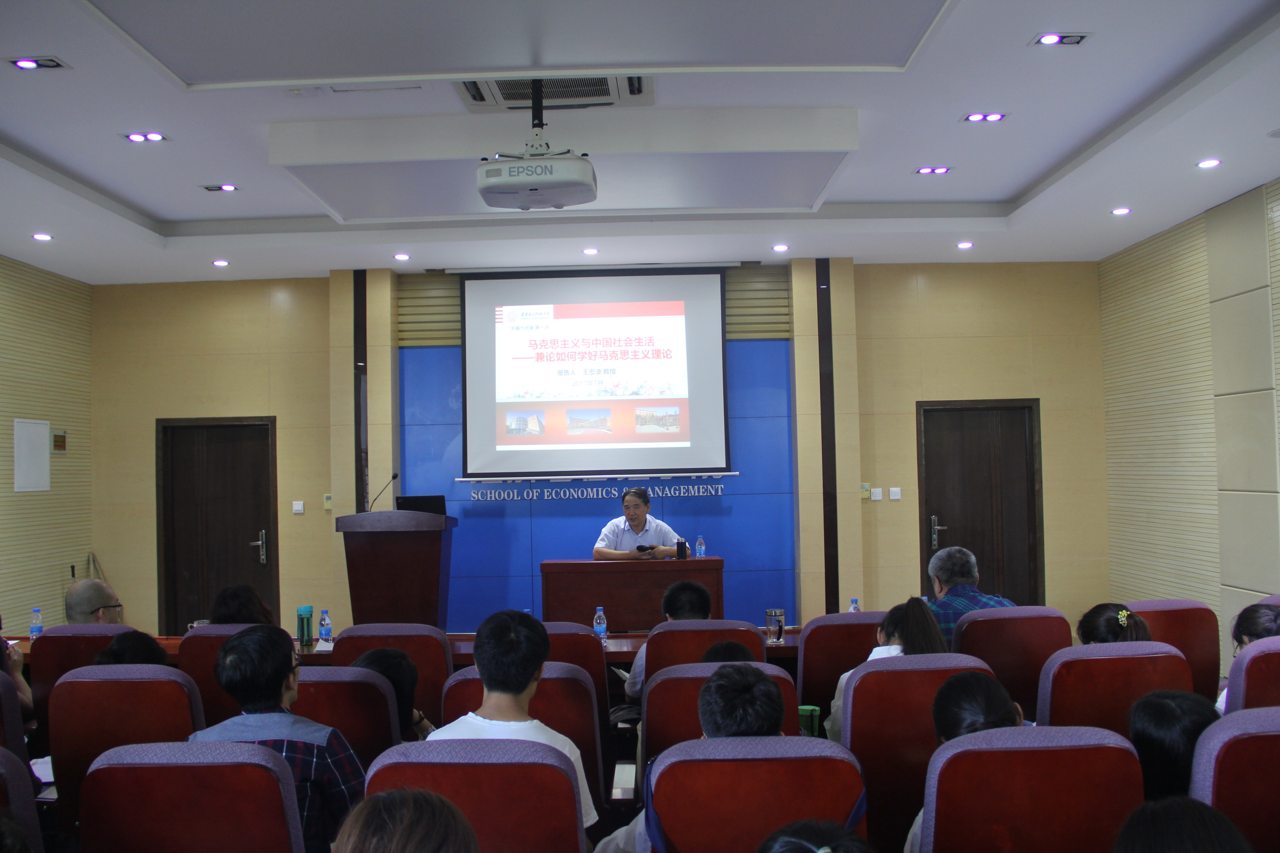 王宏波教授的报告提出了马克思主义理论与当代中国社会生活的关系这一重大问题。王宏波教授从三个方面对这一问题进行了分析和解答。首先,马克思主义影响社会生活的变迁。王宏波结合自身多年思想政治教育管理经验和中国近代社会的变迁指出,马克思主义对社会生活的影响是通过政策制定来实现的,马克思主义是制定政策的基本指导思想,而这些政策又影响了我们每一个人的生活,我们做理论需要把理论、政策、现实联系起来。其次,社会生活变迁为马克思主义提供新的研究问题。王宏波教授分别以城市扩展土地政策与收入问题、国有企业问题、农村的集体经济问题为例指出,社会生活不断发生改变导致新的社会问题不断出现,我们不能回避问题,要在马克思主义理论指导下积极解决出现的新问题。最后,马克思主义与社会工程。王宏波教授指出,新中国建立后社会进入了社会工程时代,社会的发展离不开社会工程的设计、构建,他以建国后的计划经济体制为例,提出了构建社会制度真理依据、价值依据和情景依据,以及社会工程对社会发展的重要意义。王宏波教授强调学习和研究马克思主义,要以古代哲学家张载的“为天地立心,为生民立命,为往圣继绝学,为万世开太平”激励自己。