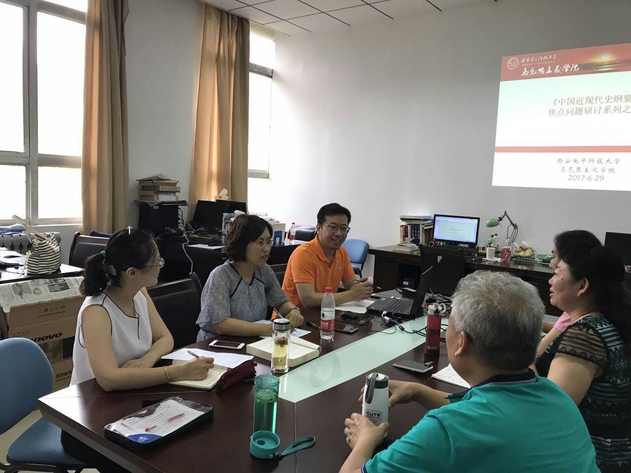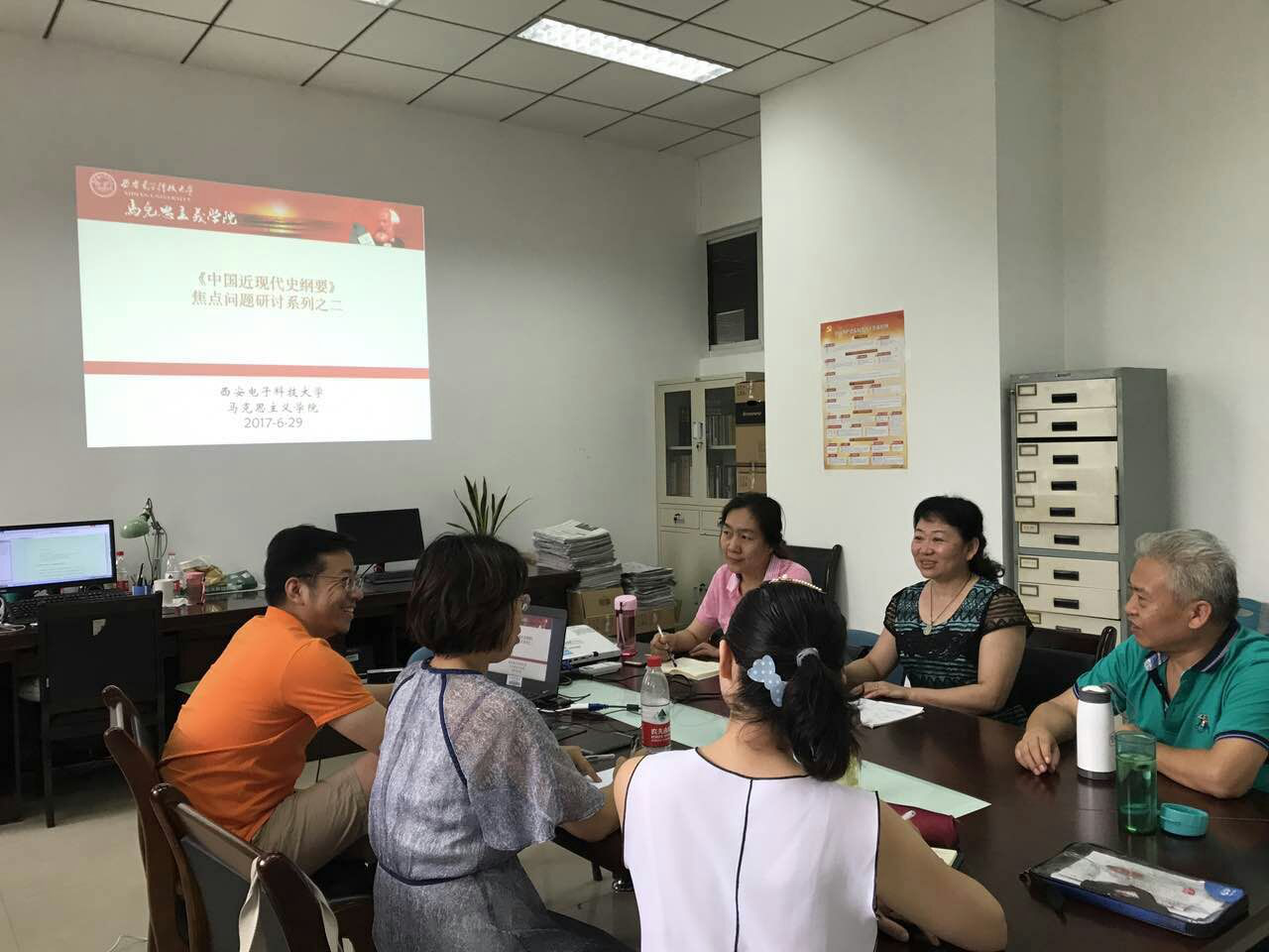 ( 通讯员:刘晓红)2017年6月29日下午,《纲要》教研室举行了第二次“中国近现代史纲要”焦点问题研讨暨备课会。会议由纲要教研室主任刘晓红主持,纲要课的各位同仁以及特别邀请的人文公司历史系朱文慧老师参加了会议。会议在轻松的话题中拉开序幕。