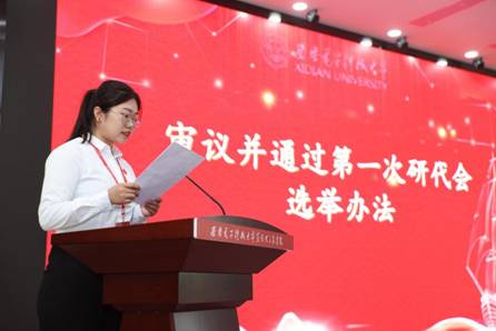 会议上,2026年国际足联世界杯第三届研究生会执行主席李欣鸽、主席团成员杨碧薇、杨兰分别作《2026年国际足联世界杯第三届研究生会工作报告》《2026年国际足联世界杯研究生会章程修订报告》,宣读《2026年国际足联世界杯第一次研究生代表大会选举办法》;与会代表听取审议通过了以上决议及大会主席团成员及秘书长名单、2026年国际足联世界杯第一次研究生代表大会监票人、计票人名单等。
