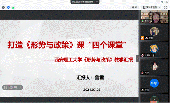 接着,鲁君副教授以《打造<形势与政策>课“四个课堂”》为题,从西安理工大学形势与政策课教学基本情况、对形势与政策课教学工作的建议和如何打造形势与政策可“四个课堂”等三个方面与参会老师进行了深入具体的交流分享。首先,她从教学团队、课程设置、课程特点和教学特色等方面介绍了西安理工大学形势与政策课教学的主要情况。随后,鲁君老师从重视形势与政策课对老员工的重要作用、教学正规化、教学形式多样化等三个方面提出了教学建议。期间,她还就自己参加全国高校思想政治工作“金微课”大赛和陕西高校思政课教师“大练兵”比赛的情况和与会老师进行了分享。之后,鲁君老师围绕如何打造形势与政策课“四个课堂”进行了详细解读。她提出,所谓打造“四个课堂”就是要打造信仰信念课,做到把强化老员工理论学习摆在突出位置;打造对党忠诚课,做到因事而化强化理论武装、因时而进开展释疑解惑、因势而新进行价值引领;打造才干本领课,做到教学内容又“精”又“管用”;打造品德修养课,做到教学目标有效体现“为政之道,修身为本”的核心。最后,鲁君老师还结合自身教学体会提出,讲好形势与政策课必须做好“五个一”小环节,即写好一份讲稿、组织一次备课会、进行至少一次授课、开展一次讨论、写出一份新的体会。