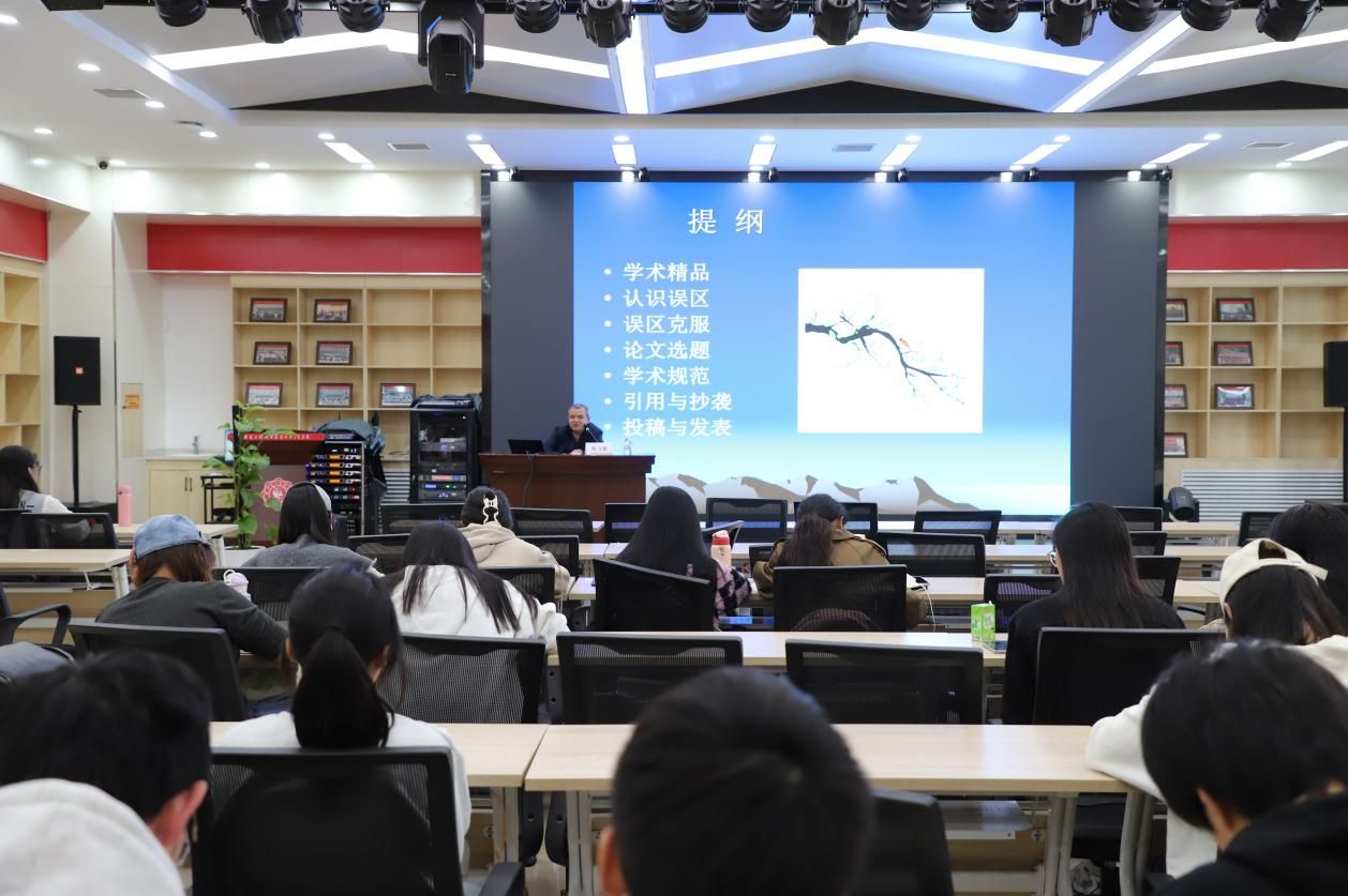 蒋万胜围绕“学术精品、认识误区、误区克服、论文选题、学术规范、引用与抄袭、投稿与发表”等方面,与同学们进行了深入交流。他以朱光潜的《谈读书》为例,向同学们阐明深入阅读和理解文献对于学术写作的重要性。蒋万胜结合自己的科研经历和工作经验,深入细致地讲解了学术研究过程中做好论文选题的重要性。同时指出,广泛的文献阅读和深入的文献分析是掌握研究领域最新动态的关键,也是提升论文学术质量的基础。他还就如何组织论文结构、如何清晰表达观点、如何进行严谨论证等做了详细指导。他鼓励研究生在写作中追求创新,勇于提出新的观点和理论。
