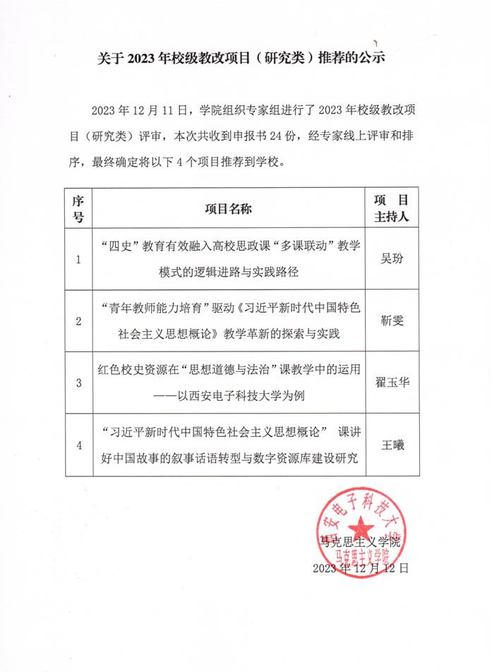 关于2023年校级教改项目(研究类)推荐的公示