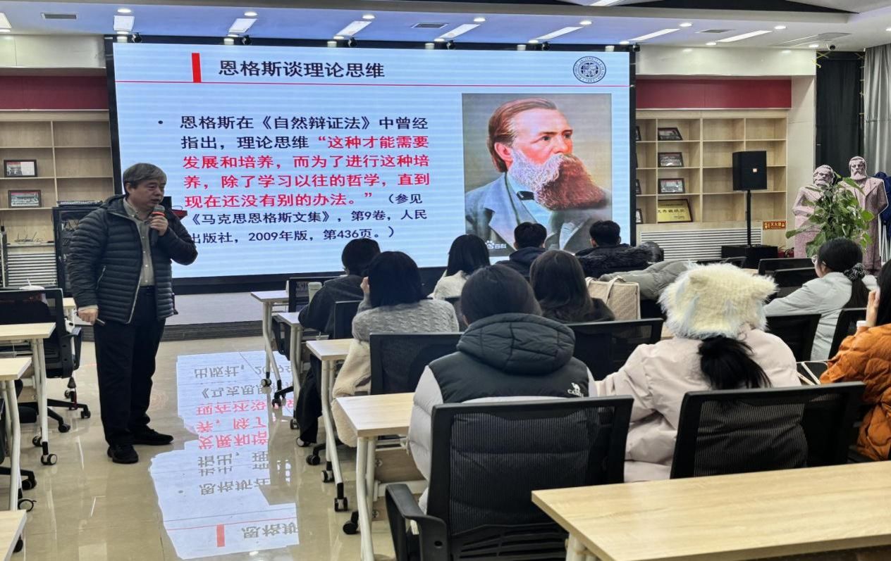陈中奇做了“马克思主义经典文献学习的基本思路”的主题分享。他以习近平总书记关于理论学习的重要论述为切入点指出:“读原著、学原文、悟原理”是学习马克思主义理论的根本方法。他结合恩格斯在《自然辩证法》及多封书信中对理论思维培养、原著研究的重要论述,强调了研读经典原文的必要性。