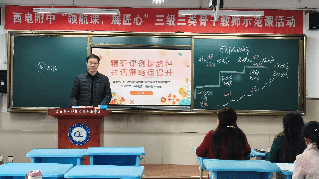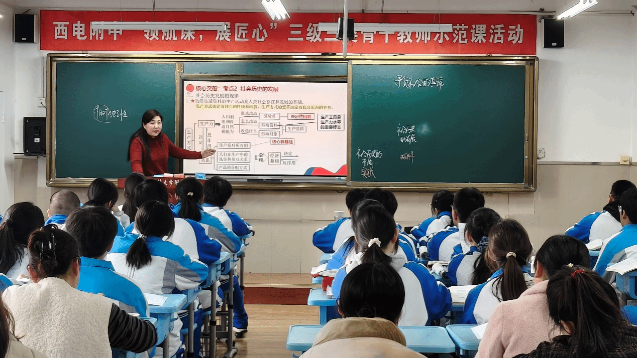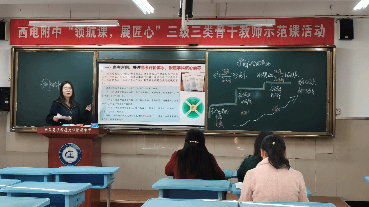 活动伊始,西电附中杜宁老师以《寻觅社会的真谛》为题展示高三一轮复习课。课堂以新职业为线索,融合唯物史观与时代热点,创新引入“教师数字人”,通过课前、课中、课后联动及高考真题训练实现学考衔接。
