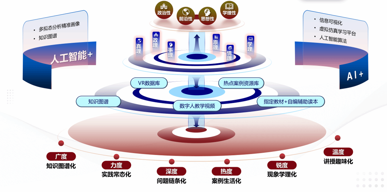 王艳老师以扎实的教学功底和对智慧教育的深刻理解,巧妙地将生成式人工智能等前沿技术融入《思想道德与法治》课程设计之中。充分利用人工智能多拟态分析精准画像、知识图谱等功能,搭建数字人教学视频资源、配套知识图谱、自制VR案例库、红色文化案例库等线上线下相结合的“五位一体”优质教学平台,优化教学内容,使案例生活化、现象学理化、知识图谱化、实践常态化、讲授趣味化、问题链条化,更加有效的传递思政课的思想之“真”、道德之“善”、法治之“美”,进行了全方位的教学创新改革。